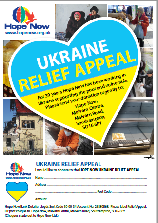 As you can imagine there is already so much need in Ukraine, we have brothers and sisters sheltering in cellars and enclosed halls for safety. During our prayer meeting with them on Monday the alarms sounded for yet another air raid. There were tears from both sides. To enable us to go back fully prepared we are launching our Hope Now Ukraine Relief Appeal and would ask that you seriously consider how you can help. Donations may be made by cheques or bank transfer, blankets, warm clothing, bandages and medications can be delivered to our office in Southampton for onward delivery to Ukraine. There is also a link that you can watch made by our team in Cherkassy. https://youtu.be/-itGD7CLDB8